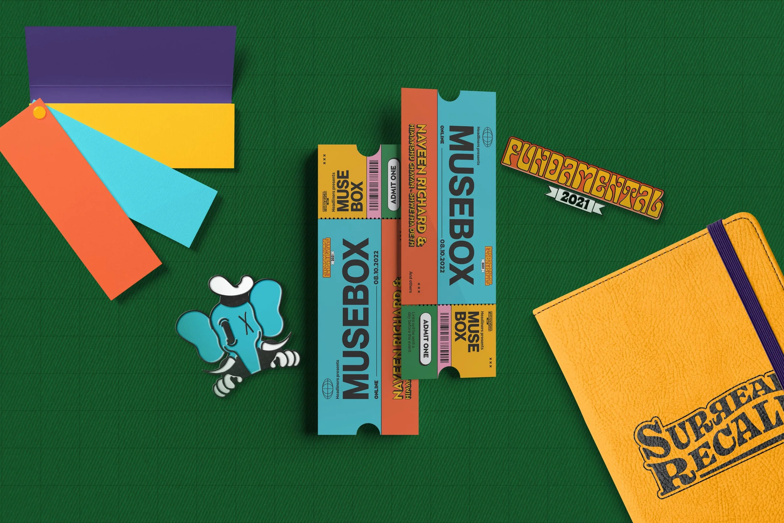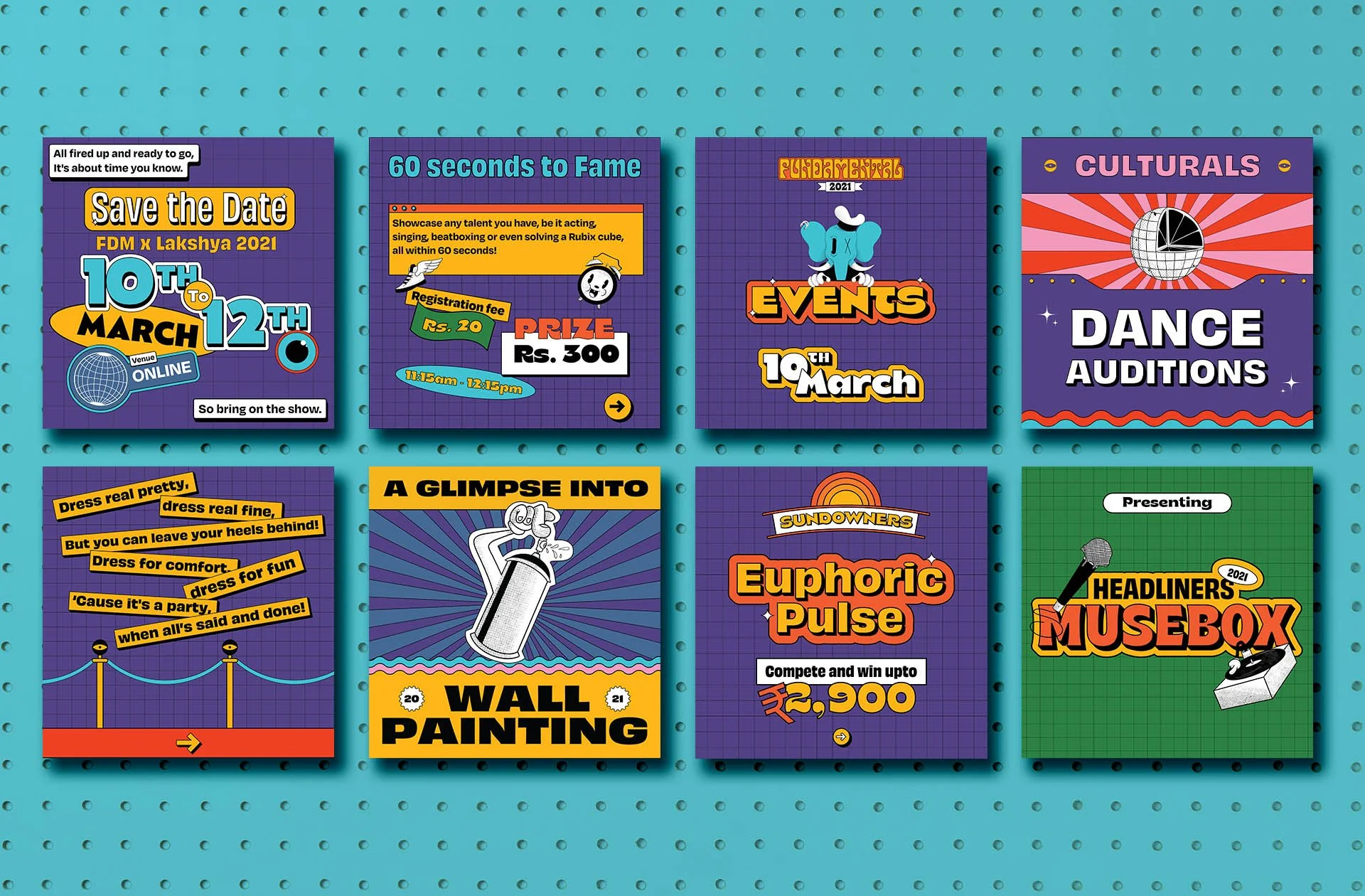 Symbiosis Institute of Design's annual fest, 'Fundamental,' was organized and run by students online due to the pandemic. The theme chosen was a retro vibe with surreal elements, using vintage posters as inspiration. The fest's mascot, Elmar, was redrawn to match the theme, modeled after 1930's cartoons from 'Fleischer Studios.' Techniques were incorporated to give a modern twist to the retro style, with maximalist and illustration-heavy visuals featuring saturated colors and more texture.